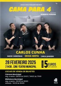 No próximo dia 28 de fevereiro, a peça de teatro “Cama para 4” sobe ao palco do Cineteatro Municipal, pelas 21h30. Os bilhetes têm um custo de 5.00€ por pessoa e podem ser adquiridos a partir das 14h00 de hoje, nos seguintes locais: