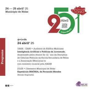 As comemorações têm início amanhã, 𝟮𝟰 𝗱𝗲 𝗮𝗯𝗿𝗶𝗹, pelas 10h00 no Auditório do Edifício Multiusos de Nelas, com a 𝗔𝘀𝘀𝗲𝗺𝗯𝗹𝗲𝗶𝗮 𝗠𝘂𝗻𝗶𝗰𝗶𝗽𝗮𝗹 𝗝𝗼𝘃𝗲𝗺, que conta com a presença dos alunos do 12º ano da disciplina de Ciências Políticas da Escola Secundária de Nelas e da Associação INterioriza-te. Subordinada ao tema “𝗜𝗻𝘁𝗲𝗹𝗶𝗴𝗲̂𝗻𝗰𝗶𝗮 𝗔𝗿𝘁𝗶𝗳𝗶𝗰𝗶𝗮𝗹 𝗲 𝗣𝗼𝗹𝗶́𝘁𝗶𝗰𝗮𝘀 𝗱𝗮 𝗝𝘂𝘃𝗲𝗻𝘁𝘂𝗱𝗲”, esta sessão apresenta-se como uma oportunidade para estes jovens estudantes experienciarem o funcionamento e importância de uma Assembleia Municipal, e debaterem sobre as oportunidades e ameaças da inteligência artificial, a forma como esta vai mudar o mundo, e o impacto que vai ter tanto na sociedade como na humanidade. Segue-se um momento dedicada às artes com a Leitura de Poemas por alunas do Grupo de Teatro do Agrupamento de Escolas de Nelas e uma atuação musical pela Academia Municipal de Artes de Nelas, em que o Corpo Docente apresenta um reportório composto por músicas que marcaram a Revolução dos Cravos. Pelas 21h30, sobe ao palco do Cineteatro Municipal de Nelas o divertido espetáculo INSÓNIA de Fernando Mendes, com sessão esgotada.