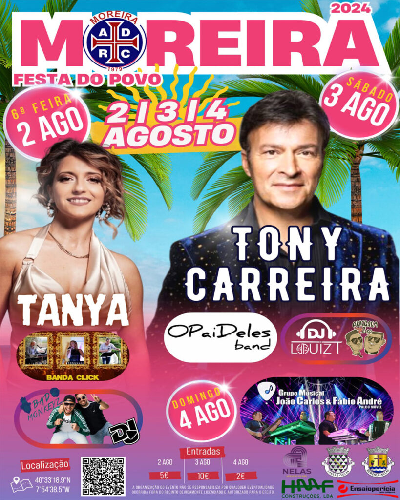 Associação Desportiva e Recreativa de Moreira, com o apoio do Município de Nelas, União de Freguesias de Santar e Moreira, organiza no fim-de-semana de 2, 3 e 4 de agosto a Festa do Povo 2024, com um programa repleto de atuações musicais e muito mais.