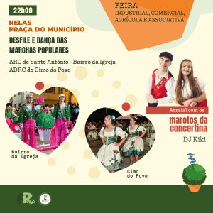 Em 𝗡𝗲𝗹𝗮𝘀, as Associação Recreativa e Cultural do Santo António – Bairro da Igreja 𝗲 ADRC Cimo do Povo Nelas animam as ruas da Vila, encontrando-se na Praça do Município, onde desfilam e dançam, em ambiente de grande festa, ao som das suas respetivas marchas. As celebrações dos Santos Populares continuam com o Arraial pelos 𝗠𝗮𝗿𝗼𝘁𝗼𝘀 𝗱𝗮 𝗖𝗼𝗻𝗰𝗲𝗿𝘁𝗶𝗻𝗮, um dueto que vai trazer muito ritmo e animação. A noite encerra com o talentoso 𝗗𝗝 𝗞𝗶𝗸𝗶, cujos ritmos e sonoridades prometem criar um excelente ambiente.