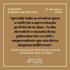 Na companhia de Ruth Santos, aluna da Universidade Sénior de Nelas, venha adoçar o seu Natal e aprenda a elaborar deliciosos Brigadeiros de Chocolate que vão certamente fazer crescer água na boca de todos os participantes!