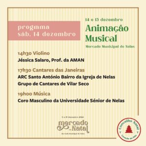 Desde o Associativismo local que vai encantar todos os presentes com uma performance de Cantares de Janeiras do Bairro da Igreja de Nelas e do Rancho Folclórico de Vilar Seco, aos professores da Academia Municipal de Artes de Nelas e Alunos da Universidade Sénior de Nelas que nos trazem as sonoridades próprias desta época festiva, o Mercado encerra com a voz de Sílvia Mitev, com Fado.