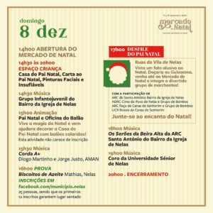O Mercado de Natal abre portas já neste próximo domingo, 8 de dezembro, e neste primeiro dia, o momento alto será certamente a espetacular chegada do Pai Natal que irá percorrer as ruas da Vila de Nelas num divertido e colorido desfile, acompanhado pelos marchantes da ARC de Santo António do Bairro da Igreja de Nelas, da ADRC Cimo do Povo Nelas e o seu Grupo de Bombos, da ARC Paço de Canas de Senhorim e o seu Grupo de Bombos, e da UCR Rossio de Canas de Senhorim. Antes do Desfile, pelas 14h00, o Mercado abre portas com a atuação do Coro Infantojuvenil do Bairro da Igreja de Nelas, seguida de uma divertida Oficina do Balão com Nuno Cadilhe, escultor de balões, que convida a participar na construção do pórtico de entrada para a Casa do Pai Natal, onde se junta também a atuação do Diogo Martinho e Jorge Justo, professores da AMAN, com “Corda A+”, o grupo Serões da Beira Alta de Nelas da ARC Santo António do Bairro da Igreja de Nelas, e o Coro da Universidade Sénior de Nelas. O dia reserva ainda momentos de degustação, com o Workshop/Prova “Biscoitos de Azeite” pelo Mathias Nelas em que o Azeite Mondegão vai ser o protagonista principal na elaboração destes deliciosos biscoitos tradicionais, apreciados por todos. A brincadeira vai ser também uma constante e não vão faltar pinturas faciais, insufláveis, visita à Casa do Pai Natal, Cartas com pedidos diversos, pipocas e todas as todas emoções desta época festiva.