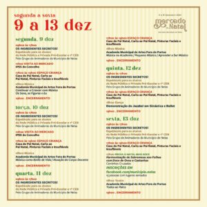 Durante a semana, de 9 a 13 de dezembro, os cerca de 800 alunos do Ensino Pré-Escolar e 1º CEB das Escolas Públicas e Privadas do Concelho vão assistir ao espetáculo “Os Ingredientes Secretos!”, encenado e apresentado pelo Grupo de Animadores do Município de Nelas e que promete muitos momentos de riso e diversão. As tardes serão preenchidas com as Atuações da “Academia Municipal de Artes Fora de Portas”, em que os talentosos alunos e corpo docente da Academia Municipal de Artes de Nelas vão trazer brilhar ao palco do Mercado de Natal, com a apresentação de um conjunto de performances na área de música e teatro que prometem encher de magia os corações de todos os espectadores nesta época festiva. Durante a semana, pode ainda desfrutar da apresentação do Jazzbell que traz momentos de Dança, Ginástica e Ballet ao Mercado, bem como a prova “O Natal mais Doce”, uma harmonização de Sobremesa de 200 Folhas com Doce de Ovos e Castanhas, orientada pelos Caminhos Cruzados.
