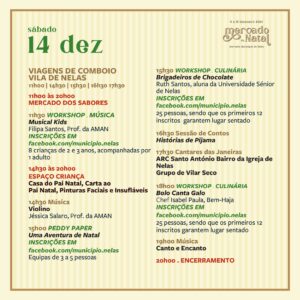 O programa de sábado, 14 de dezembro, conta com diversos workshops pensados para todas as faixas etárias. Os mais pequeninos podem usufruir do workshop “Musical Kids”, orientado pela Filipa Santos, professora da AMAN, que se apresenta como uma verdadeira experiência sensorial para promover, junto das crianças de 2 e 3 anos de idade, o gosto pela música através de sons, canções e jogos musicais. Para o público em geral, dois workshops de culinária que que vão certamente fazer crescer água na boca de todos os participantes: “Brigadeiros de Chocolate” por Ruth Santos, aluna da Universidade Sénior de Nelas e “Bolo Canta Galo” orientado pela Chef Isabel Paula, do Restaurante Bem-Haja, Nelas. Em relação à animação musical, este dia conta com uma agenda preenchida, que inicia com a atuação de Violino por Jéssica Salaro, professora da AMAN, seguindo-se os Cantares das Janeiras com a ARC Santo António Bairro da Igreja de Nelas e o Grupo de Vilar Seco, e, para finalizar o dia, a atuação do Canto e Encanto de Canas de Senhorim. No âmbito da animação e da diversão em família, decorre a fantástica Sessão de Contos “Histórias de Pijama” e ainda o divertido Peddy Paper “Uma Aventura de Natal”, que promete reunir famílias e amigos num percurso pelas ruas da Vila de Nelas, proporcionando a todos os participantes uma tarde lúdica e descontraída enquanto partem à descoberta da cultura do Coração do Dão. As 3 Equipas vencedora doeste Peddy Paper recebe ainda como prémio um Voucher de Natal para descontar nas Lojas Aderentes da Campanha “No Concelho Temos Tudo para Si… Neste Natal Compre Local”.