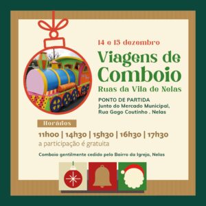 Destaque ainda para as Viagens de Comboio que nos dias 14 e 15 de dezembro percorre as ruas da Vila de Nelas no período da manhã às 11h00 e da tarde às 14h30, 15h30, 16h30, 17h30.