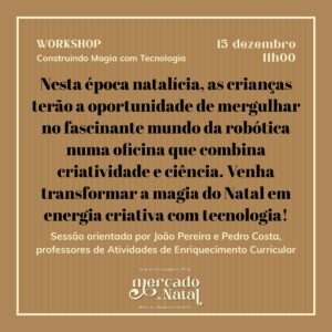 - Este workshop, orientado por João Pereira e Pedro Costa, professores de Atividades de Enriquecimento Curricular, irá desafiar as crianças a fazerem construções com células e darem vida às suas próprias criações, recorrendo a baterias que irão alimentar os seus robôs. Com uma abordagem prática e divertida, esta atividade inspira a curiosidade científica e estimula habilidades como resolução de problemas, trabalho em equipe e inovação. Venha transformar a magia do Natal em energia criativa com tecnologia!