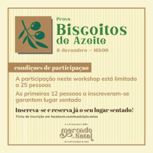 - A Prova de 𝐁𝐢𝐬𝐜𝐨𝐢𝐭𝐨𝐬 𝐝𝐞 𝐀𝐳𝐞𝐢𝐭𝐞 convida os participantes a explorar e provar os sabores únicos do Coração do Dão. Nesta sessão orientada pela empresa Mathias, o Azeite Mondegão vai ser o ingrediente principal na elaboração destes deliciosos biscoitos tradicionais, apreciados por todos.