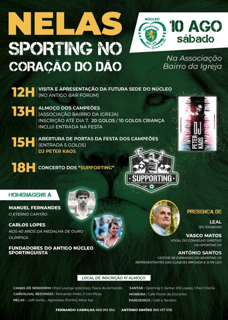 O Núcleo do Sporting de Nelas organiza no próximo sábado, dia 10 de agosto, o evento Sporting no Coração do Dão, com várias atividades e convidados ao longo do dia. O evento acontece na sede da Associação do Santo António – Bairro da Igreja de Nelas e os bilhetes para a festa e concerto ”Supporting “ vão ser vendidos no local a partir das 15h