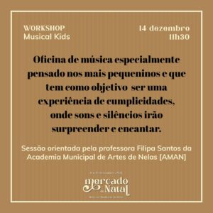 Esta oficina de música apresenta-se como uma experiência sensorial única a não perder! Através de sons, canções e jogos musicais, esta sessão, orientada pela professora Filipa Santos da Academia Municipal de Artes de Nelas, procura promover o gosto pela música junto dos mais pequeninos, ao mesmo tempo que promete muita diversão, sorrisos e partilha!