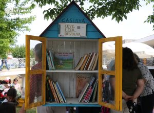 Junto à fachada da Biblioteca Municipal, onde foi pintado o Mural da Arte Urbana “António Lobo Antunes”, e junto da Casinha de Leitura, 50 alunos do 1º ano do Centro Escolar de Nelas, participaram numa divertida dinâmica de partilha de livros, colocando e levantando exemplares da pequena biblioteca comunitária para momentos de leitura na zona relvada envolvente, promovendo assim o contacto com os livros num ambiente descontraído e ao ar livre.