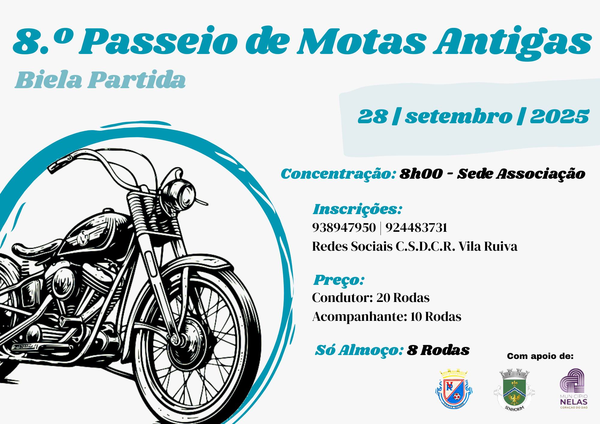 No próximo dia 28 de setembro de 2025 realiza-se o 8.° Passeio Motas Antigas “Biela Partida”, com concentração às oito da manhã na sede do Centro Vila Ruiva. Inscrições através das redes […]